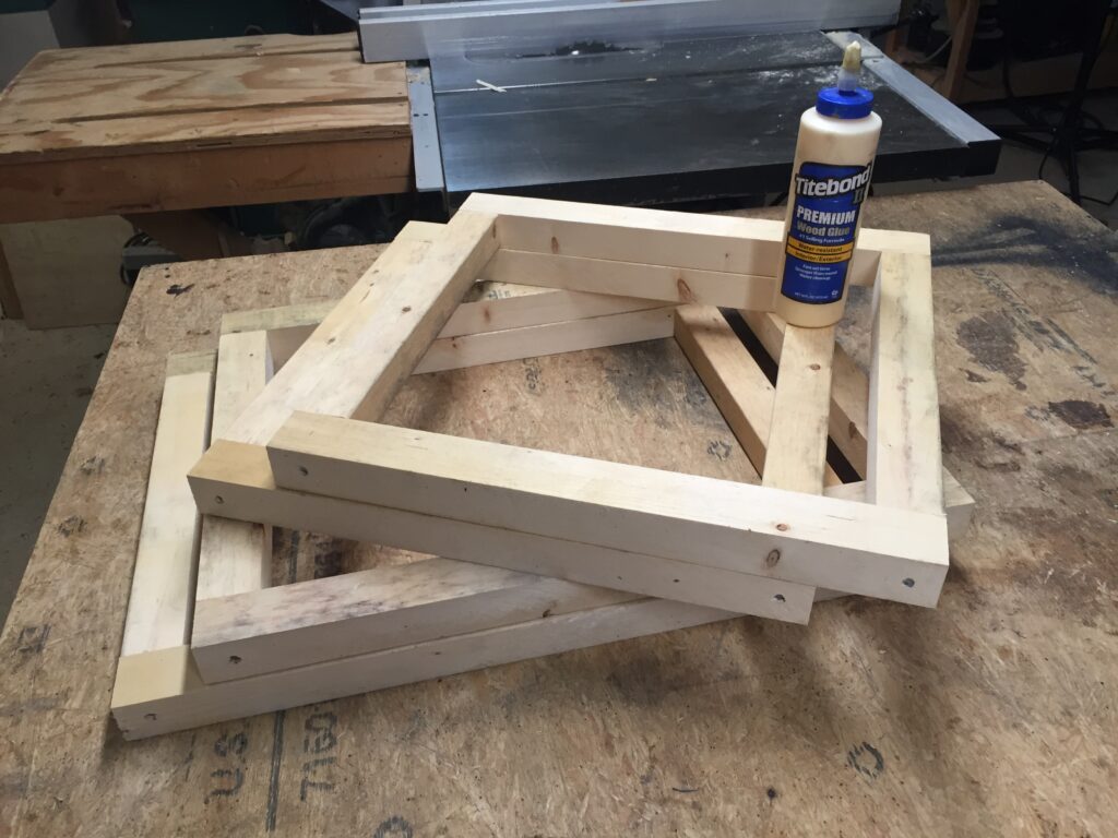 Framework. Build the framework for the walls first. Use the 1-5/8" x 1-1/2" pieces cut from the 2x6x10. Make sure pieces are turned so that the finished frame is 1-1/2" thick (not 1-5/8"). There are 2 walls @ 21-7/8" x 20-1/4" and 2 walls @ 17-7/16" x 20-1/4". I only put one nail in each joint, as the next step will be the strength of the wall.