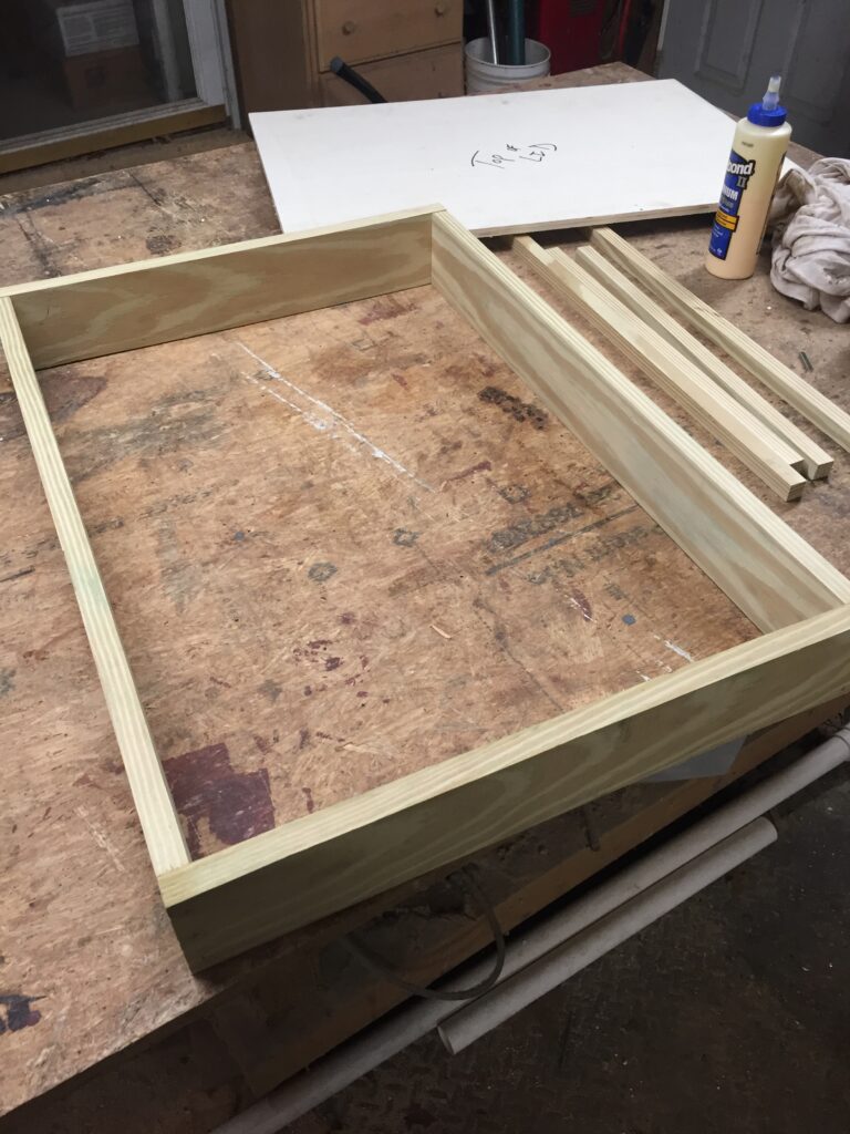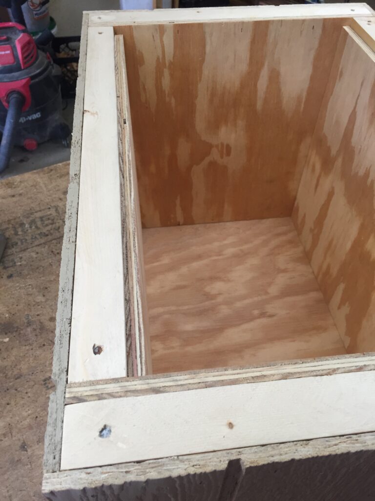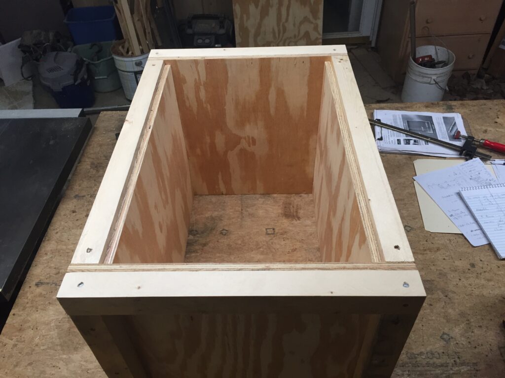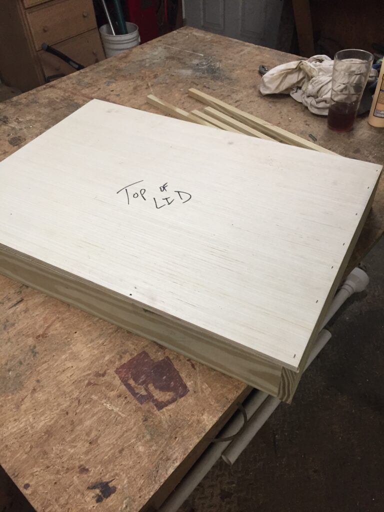 4. Install the "Bottom of Lid" piece of 1/2" plywood next, fastening to the 3/4" strips.
