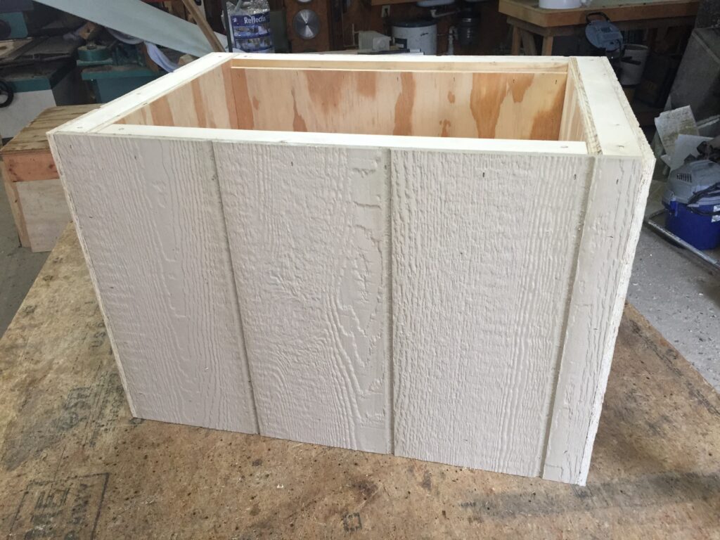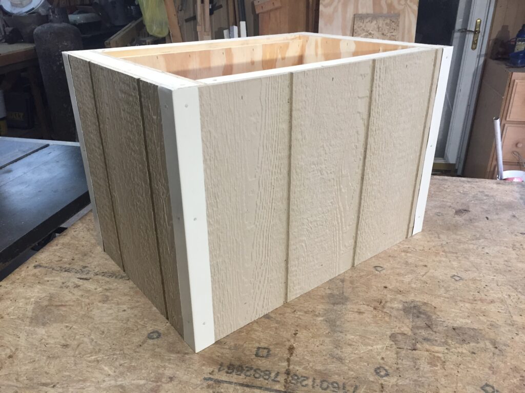Siding. Put siding on the sides first then ends. I glue and staple (1") the siding into place. Make sure the siding is flush with the top edge of the hive. There will be overhang along the bottom. This overhang will overlap the hive stand to keep the hive in place on the stand without having to tie the hive down.