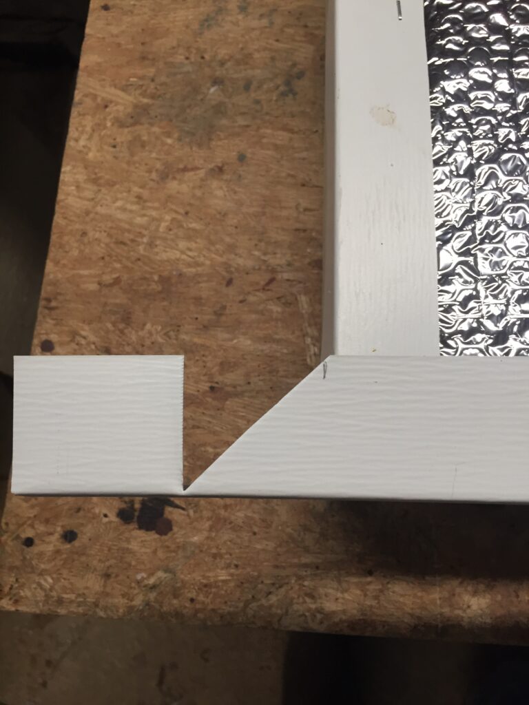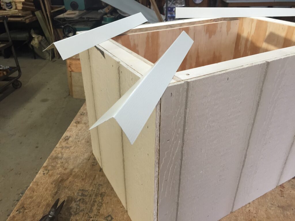 Corners. I make these corners out of aluminum coil stock, but 3" flashing, bent 1-1/2" x1-1/2" and cut to 20-3/4" long does the same job. Fasten the corners in place flush with the bottom of the siding. It will be 1/4" short of the top. The top edge will be under the lid and by leaving it a little shorter than the sides, helps to not snag my bee jacket when working the hive.