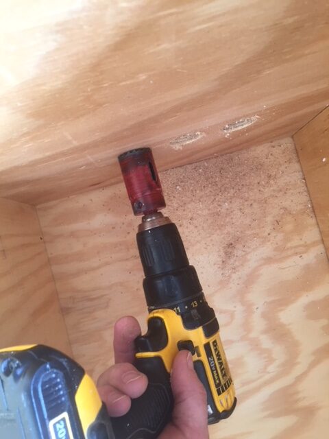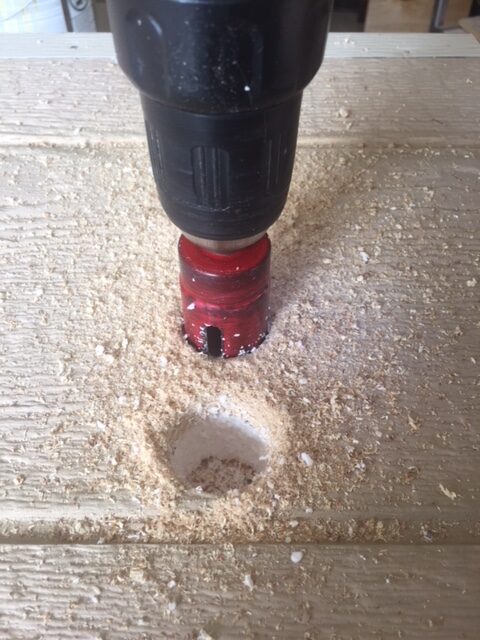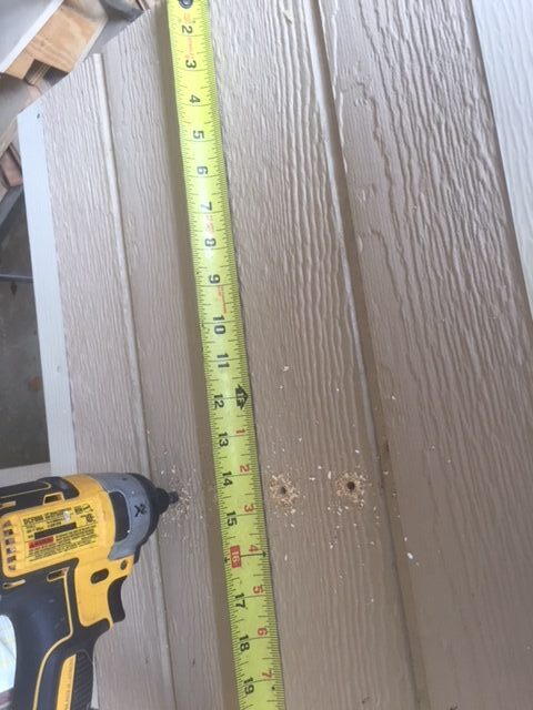 Entrance holes. Use a 3/16" bit to drill pilot holes for the 1-5/16" hole saw. Placement is 14-1/2" down from the top, 2" apart, centered in the end wall. Drill the pilot holes as straight as possible, through the siding, insulation and plywood. Using the hole saw drill the 1-5/16" holes.