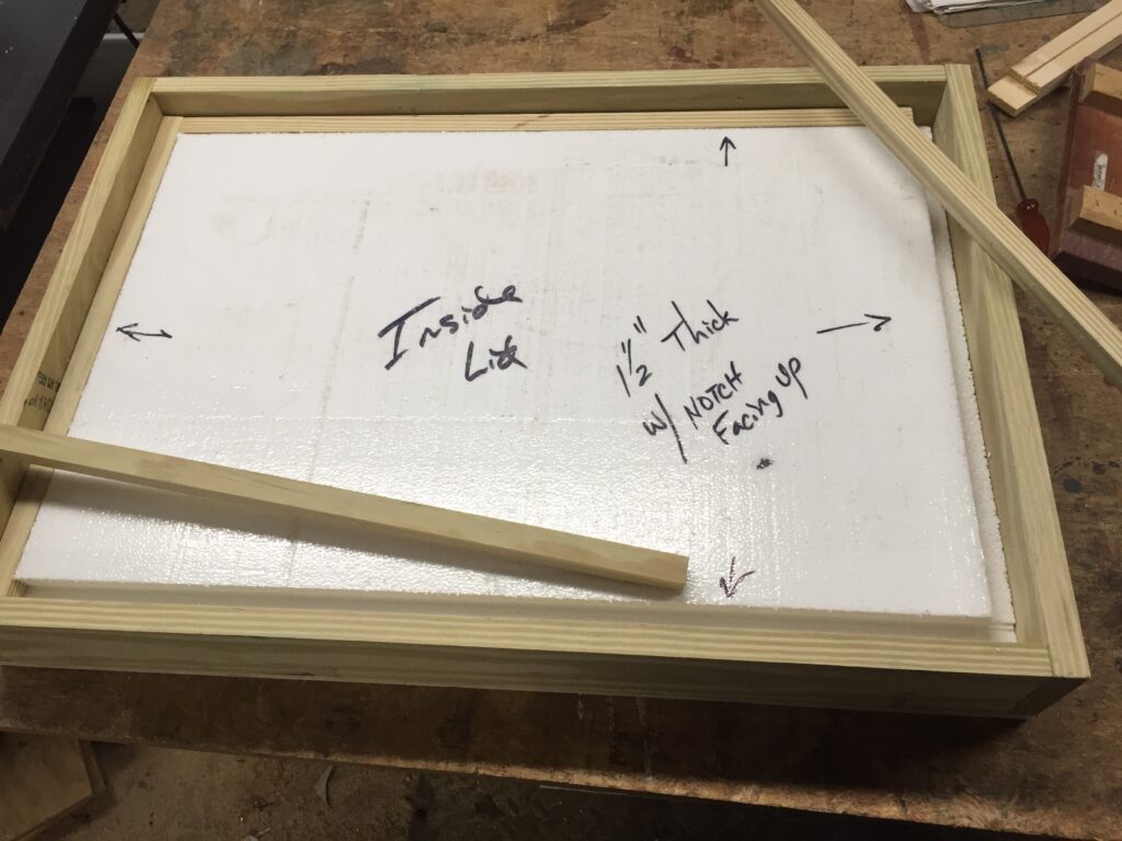 3. Insulation - Cut two pieces of 1-1/2" insulation board to fit inside 1x frame. One is square on all sides the other needs a 3/4" x 3/4" rabbet cut on the bottom edge. This is where the 3/4 nailing strip for the bottom will be fastened. Place the square piece in first and the one with the rabbet in second with the rabbet facing up. Cut the 3/4' wide strip set aside from the 1x6x8' into 4 lengths to fit in the groove cut in the bottom piece of insulation. Fasten in place per picture.