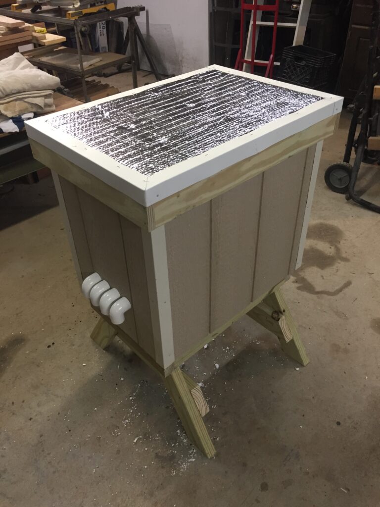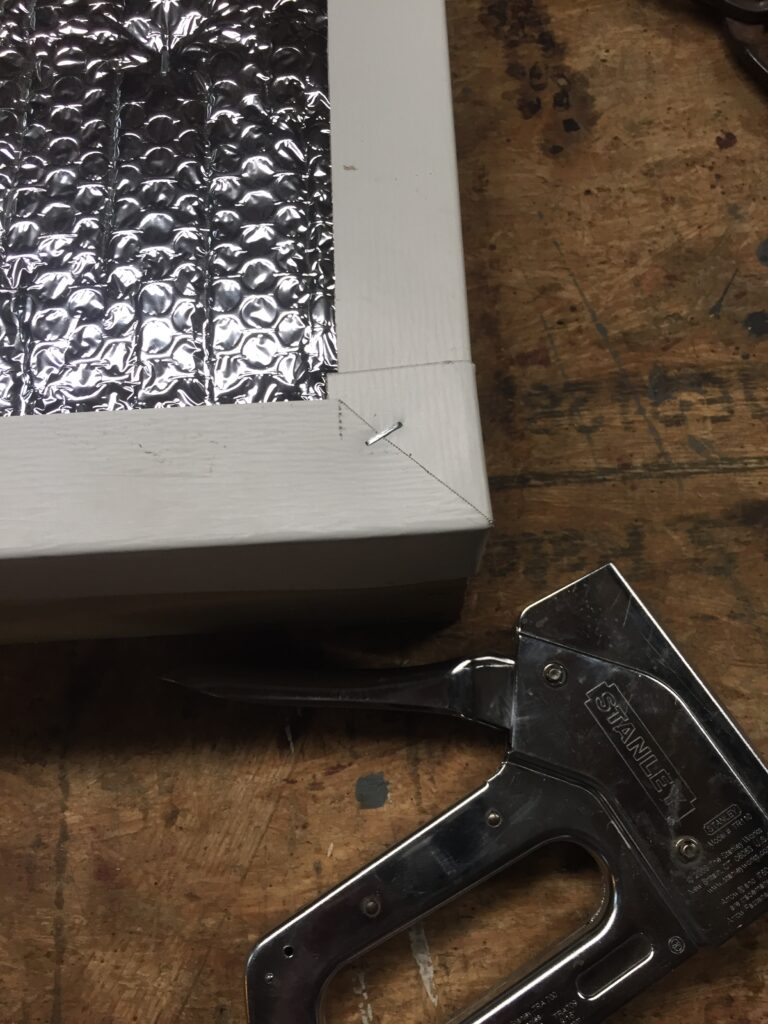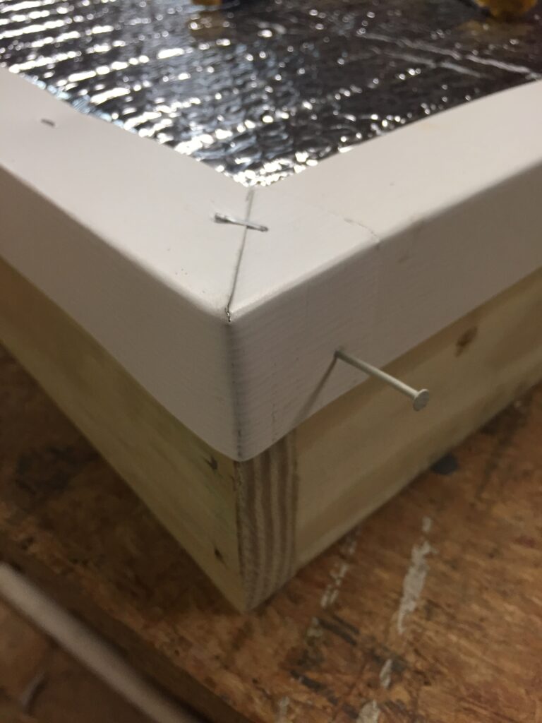 5. Bubble wrap insulation or felt install. Fasten the bubble wrap with staples and then trim to fit. Cap the corners with flashing bent 1-1/2 X 1-1/2 like the corners of the hive body.