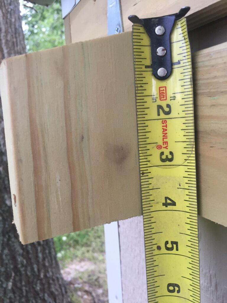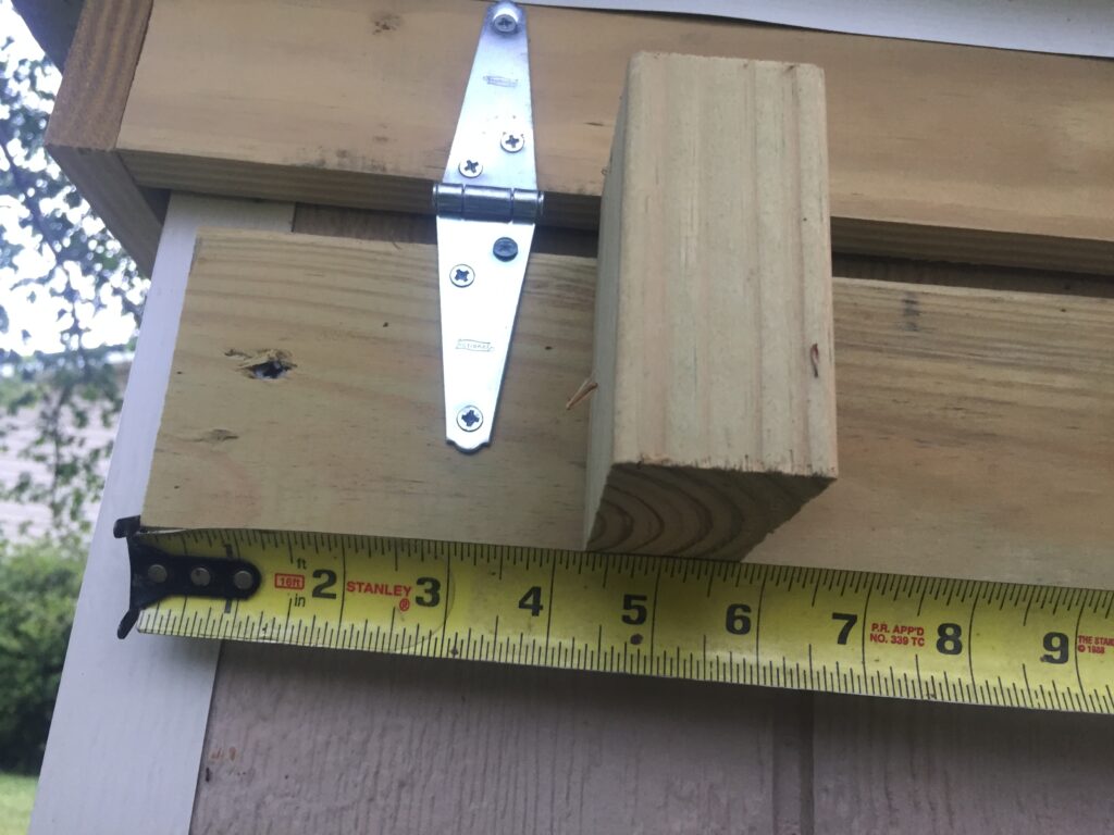 Screw the 1" x 3-1/4" x 25" piece onto the hive body on the hinge side remembering that you only have 2" of solid wood on each edge to attach to. One screw on either end angled outward and one centered, angled upward to catch the top of the hive wall frame. On the latch side, mount the catch for the latch in place.